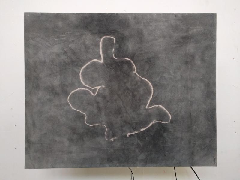 Ce dispositif est un monochrome thermochromique lié à ses auteurs. Uniquement quand ils entrent en connexion cérébrale avec la pièce, celle-ci révéle le motif qu'elle contient. C'est grâce à un casque élèctroencéphalographique et une connexion internet qu'ils (les auteurs et la pièce) peuvent entrer en connexion. La peinture est connectée à internet et attend l'ordre d'un des auteurs; celui-ci connecte ses ondes cérébrales à un ordinateur et enregistre les échanges élèctriques entre ses neuronnes. Dès qu'un certain évènement dans son cerveau (désignée comme l'intention d'intéragir avec la pièce) est enregistré, la peinture se réchauffe pour manifester la présence.