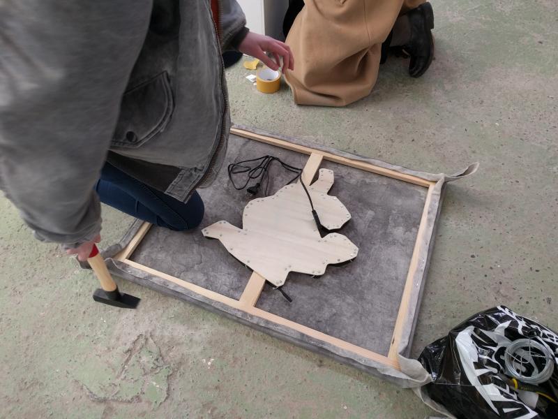 Le dispositif est exposé à quelques centimères du mur, il est essentiel de voir l'envers du décor, comment la connexion opère entre le tableau et les auteurs.